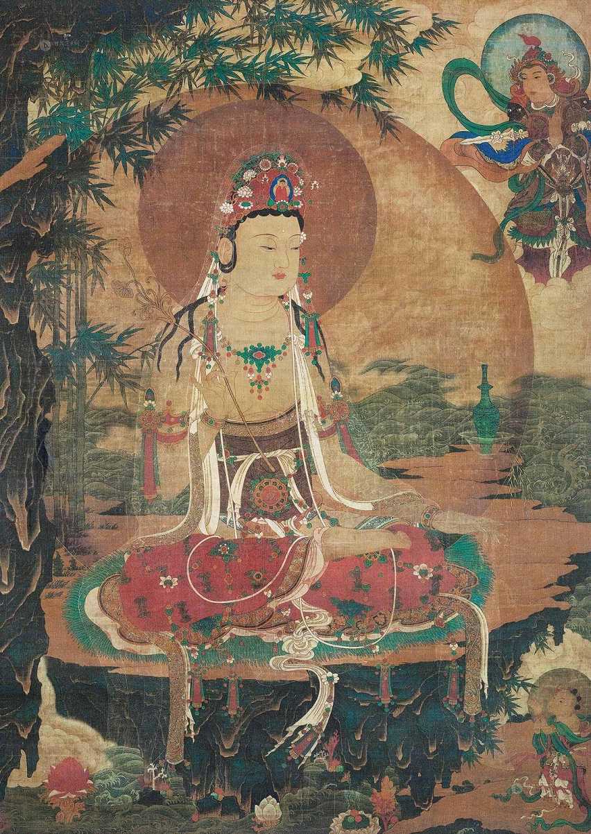 水月观音是汉传佛教三十三种观音菩萨形象中的一种,顾名思义,表现的是观音作观水中月影状,因其独特的神韵和深远的宗教隐喻,深受信徒的喜爱,是寺院和信徒供奉的观音塑画像里最常见的形象。有趣的是,在印度、尼泊尔较早或同期的佛造像以及绘画艺术作品中,并没有水月观音这样的造型。这是因为,包括水月观音在内的民间流传广泛的“三十三种观音”的渊源,乃是印度佛教东传后,中国的佛教徒根据《妙法莲华经·观世音菩萨普门品》中关于观世音菩萨所化现的三十三种身份不同的众生形象,融合汉族传统绘画艺术和审美情趣,充分发挥想象力而应机绘制出来的。