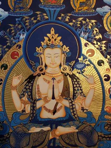 在金刚乘中,最让人喜爱修的法门是四臂观音和千手千眼观音。四臂观音的报身相中;白色的身代表清净无瑕,四臂代表四种佛行,即息、增、怀、诛等。“息”是平息所有的痛苦,障碍及困难。“增”是增加福报、智慧、长寿、财富等。“怀”是救度众生,领导他们修行。“诛”是诛灭他们种种恶念,克服外界魔等。四臂的手,前两隻合什胸前,抱著一颗如意宝珠,代表能满足所有众生的要求。另外两手是:右手持一串水晶念珠,代表不停地救度众生。