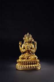 四臂观音是大悲观世音菩萨的化身像之一,一般形象为一面四臂,二腿;头戴五佛花冠,花冠正中是阿弥陀佛像。此尊面像圆润广正,低眉垂目,双眸半闭,小口紧抿,寂静含笑,神态宁静,以菩萨慧眼慈悲凝视有情众生;菩萨身穿轻柔天衣,坦胸露腹,双耳下垂八瓣花珍宝圆耳环,项戴珍宝项链、胸前佩有联珠式珍宝璎珞,腰间束宝带,多处镶有绿松石和红宝石。