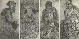 到了五代时这类绘画就更多起来,如南唐的陶守立(见《式古堂书画考》二)、王齐翰(见《宣和画谱》四、《清河书画舫》五、《秘殿珠林》九),前蜀的李升(见《宣和画谱》)、张玄(见《宣和画谱》三、《清河书画舫》五),吴越的王道求(见《式古堂书画考》二),都有此类作品,而以前蜀贯休为最知名(见《清河书画舫》五、《妮古录》、《式古堂书画考》十),宋代孙知微(见《清河书画舫》六)、李公麟(见《珊瑚网》二三、《弇州四部稿》一三七、《式古堂书画考》二、《秘殿珠林》九、十、《书画鉴影》二、《宝绘录》十、《平津馆鉴藏书画记》、《江村书画目》、《好古堂家藏书画记》上、《三秋阁书画录》二)、颜博文(见《式古堂书画考》二)、李时择(见《式古堂书画考》二)、梁楷(见《书画鉴影》三)、孙必达(见《秘殿珠林》九);僧中如梵隆(见《珊瑚网》二三,《弇州四部稿》一三七、《式古堂书画考》二、《大观录》一四、《江村销夏录》一、《春霞阁题画绝句》)、月蓬(见《式古堂书画考》二)、海仑(见《秘殿珠林》九、十);元代赵孟頫(见《秘殿珠林补编》十)、钱选(见(盛京故宫书画录》三),明代吴伟(见《秘殿珠林》二集)、仇英(见《过云楼书画记》四、《江村销夏录》一、《盛京故宫书画录》三)、吴彬(见《石渠宝笈》三)、丁云鹏(见《石渠宝笈》二、三)等,都有名作见于历代的著录。