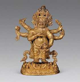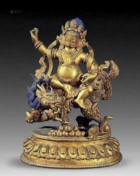 他头戴五佛冠,头顶有象征愤怒的火焰。三只眼,张着大嘴。左手持三股戟,右手拿一根短棒,有时是两手置胸前拿绳索。他坐在一条龙身上,为舒坐势。龙张牙舞爪,头尾高高翘起。龙有四脚,前面右脚踩一个圆形物。这位财神在藏传佛教寺庙里也较常见。