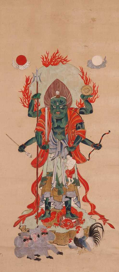 ...查看更多青面金刚印相,有立身印、钩印等十四种,其中,立身印系将左手三指直竖,大拇指捻小指甲上,以四指向前之方式叉腰上;左手五指按面上,且面作嗔色。其真言有大咒、心咒、立身咒等,其中以立身咒为较常用。古来俗将青面金刚与庚申混同,而以青面金刚为庚申之本地,并盛行此尊之祭祀。