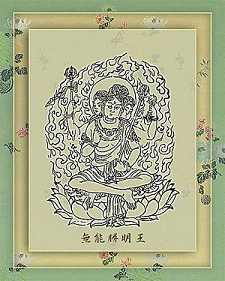 明王,梵语曰Vidy-a-raja。明,指破愚闇之智慧光明,亦指真言陀罗尼。一般明王,多指秉受如来之教令,为摄召众生而示现愤怒形者。因此,明王,即“教令轮身”。